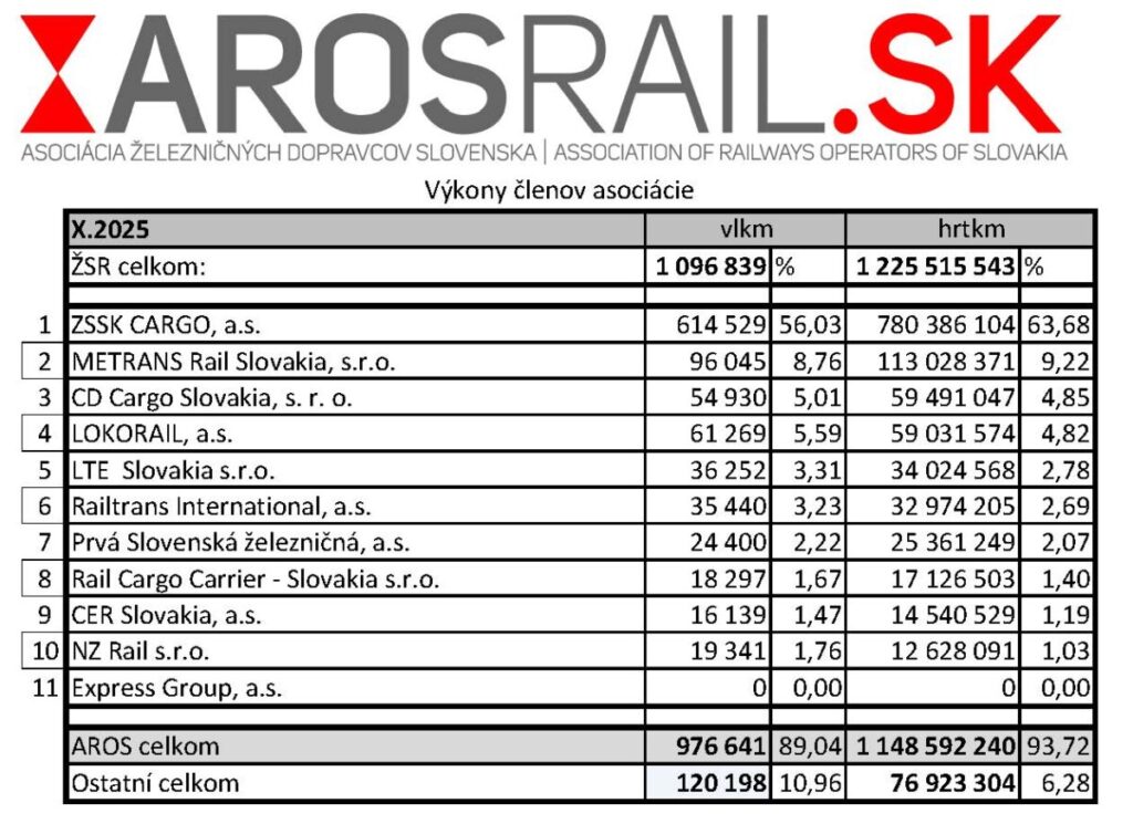 Díky spolupráci s AROSEM a jeho výkonným ředitelem panem Patrikem Benkou Vám všem můžeme poskytnout informace o výkonech nákladní železniční dopravy na Slovensku a to nejen za 10/2025.